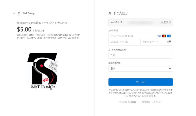 大手決済サービスの「Stripe」様と連携しておりますので、クレジット決済が可能です。