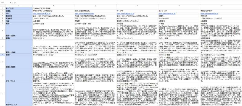 例1)企業情報に関するキーワード:例)「工作機械」➡企業情報とリンクを回答