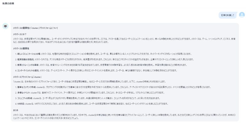 chatGPTなどの単体LLMと大きく異なる点は、いろいろなツールと組み合わせることでカスタマイズが可能になり、この例では、「記事を執筆して」と入力するだけで、これだけのアウトプットを出してくれます。