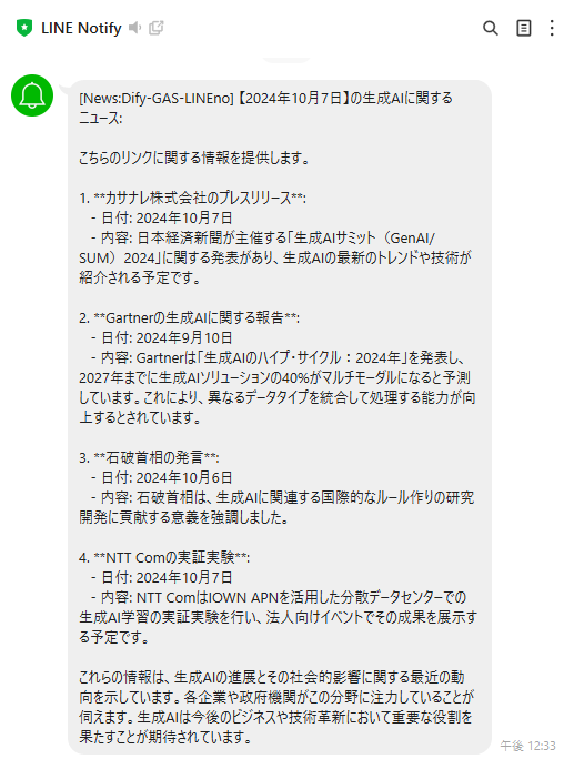 例)毎日12時~13時に「生成AI」に関するニュースを提供してくれます。